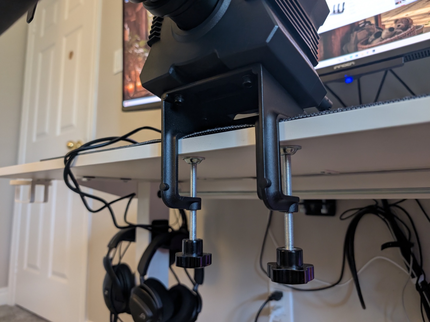Moza è presente nel settore delle corse sim da un po' di tempo e ha un design unico. L'R5 ha lo stesso design degli interassi R9 e R12, ma è più compatto. Le sue dimensioni e il suo peso lo rendono molto più comodo da montare su una scrivania utilizzando il morsetto in acciaio per impieghi gravosi incluso. Il morsetto stesso ha un angolo di 15 gradi che posiziona il volante in modo più ergonomico. Un problema del morsetto, tuttavia, oltre a non essere regolabile, è che le viti sporgono un po' e a volte colpiscono le gambe. Ha un ampio spazio per tavoli di diverse dimensioni e un'imbottitura in schiuma per non graffiare il tavolo.