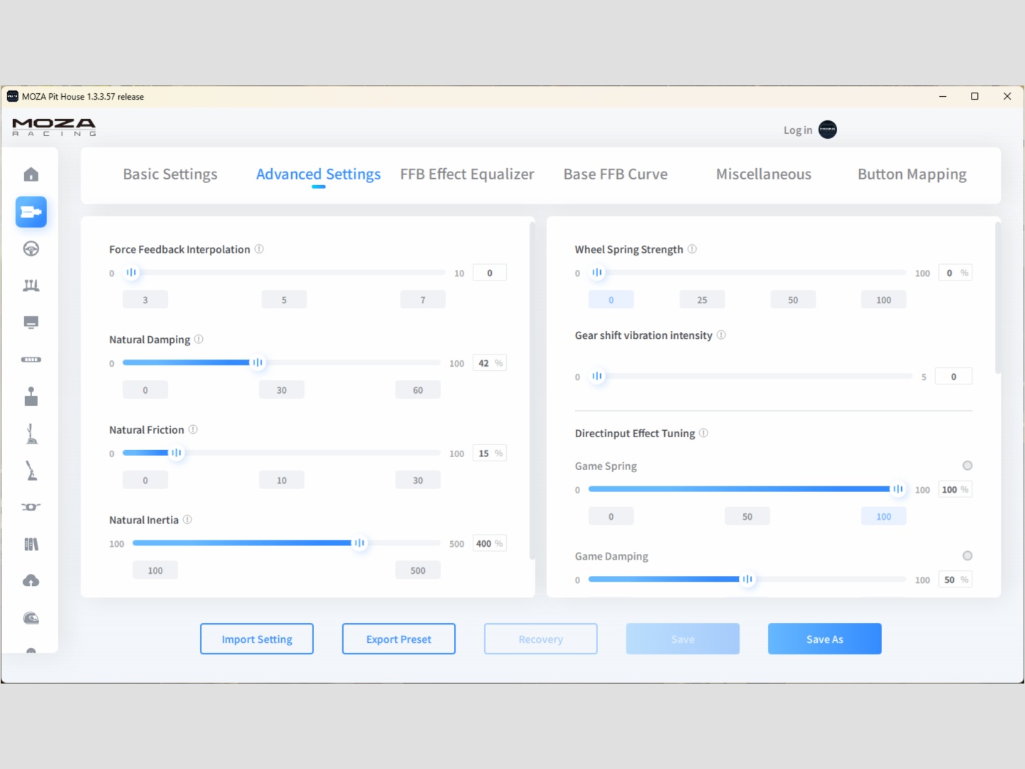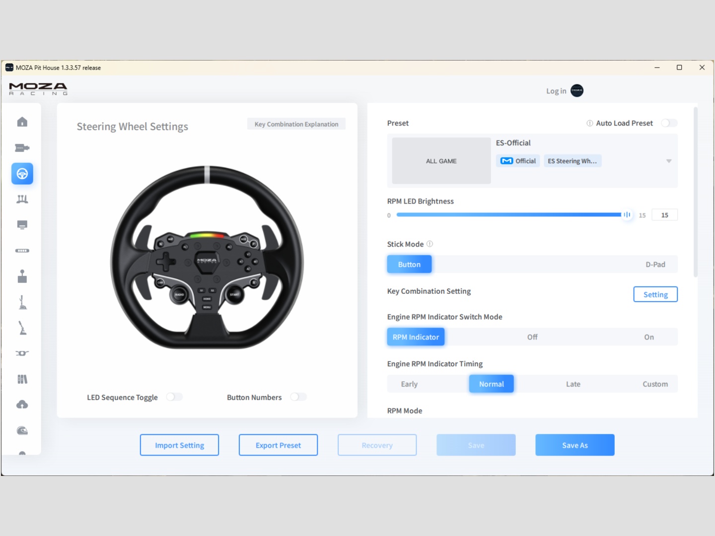 Per quanto riguarda il software Moza Pit House, è possibile effettuare regolazioni granulari del passo per personalizzare ogni aspetto del feedback. È facile da usare e da capire, e consente anche di creare, importare ed esportare profili. Anche la rotazione e i LED dei volanti possono essere personalizzati in base a diverse gamme di giri e colori.
