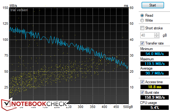 L'hard disk da 500GB Western Digital è un modello standard. E' comunque abbastanza veloce avendo una velocità di scrittura media pari a 90.7 MB/s ed una velocità di picco di 119.5 MB/s. Non abbiamo riscontrato alcun problema o calo delle prestazioni. Questa combinazione crea un apporto di carico alla CPU pari al 5.4%.