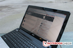 E' possibile visualizzare molte cose sul grande schermo del notebook - ma all'esterno la cosa che si vedrò meglio saranno i riflessi dell'ambiente circostante. Lo schermo è infatti estremamente riflettente e ciò lo degrada a specchio retrovisore. Questo fatto, unito all'intensità dei colori che diminuisce a seconda dell'angolo di visualizzazione, è una combinazione sconveniente. Lo schermo manda di luminosità per compensare queste lacune. Per questo, l'apparecchio è adatto al solo uso all'interno.