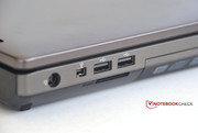 L'obbligatorio blocco Kensington è sulla destra a fianco dell'uscita della ventola. Una DisplayPort, USB 2.0 e una porta combinata per eSata e USB 2.0 sono posizionate più verso il fronte. Oltre a queste sull'angolo frontale a destra troviamo, l'ingresso per il microfono e l'uscita delle cuffie. Sfortunatamente, non è installata nessuna porta USB 3.0. C'è anche la porta per la stazione docking e un connettore per una batteria esterna.