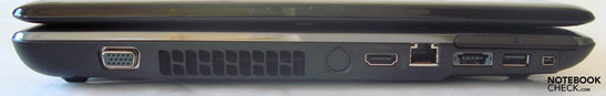 Il lato sinistro ospita una uscita analogica VGA che supporta la massima risoluzione di 2048X1536 pixels per monitor esterni, un dotto di ventilazione per la dissipazione del calore, un connettore HDMI ed una porta LAN. Troviamo inoltre uno slot Express Card, una porta combo E-SATA/USB 2.0, una ulteriore porta USB seguita da una connessione Firewire.
