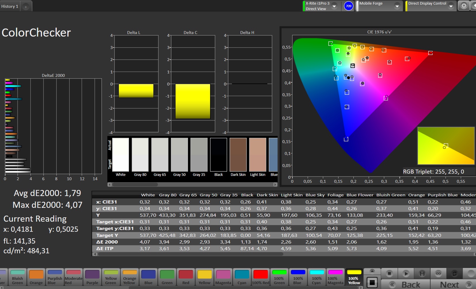 | Colorchecker dE 2000 max. * | 4.01 | 3.2 20% | 1.8 55% | 4.2 -5% | 3 25% |