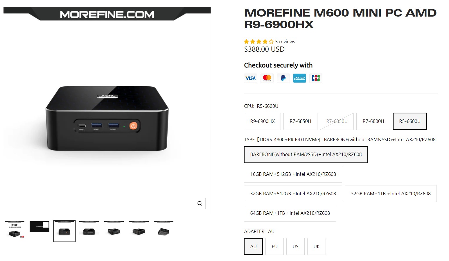 Attualmente è possibile acquistare Morefine M600 6600U direttamente dal produttore https://morefine.com/en-de/products/morefine-m600-mini-pc-amd-6900hx-6800u-6600u?variant=40036452466775. I prezzi per la versione barebone con AMD Ryzen 5 6600U partono da 388 dollari.