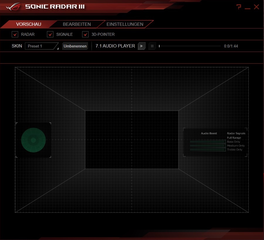 Asus si attiene ai suoi principi in questo settore. Il cosiddetto Gaming Center è il principale punto di chiamata e combina molte funzioni con un'interfaccia futuristica. Oltre ai componenti più importanti, si può anche vedere l'utilizzo del dispositivo di memorizzazione e RAM, così come le frequenze di clock e le temperature della CPU e GPU. Nella parte inferiore, troverete vari link a programmi secondari come Aura (gestisce la retroilluminazione della tastiera), Gamevisual (contiene vari profili di immagine), Sonic Radar III /Sonic Studio III (si occupa della produzione del suono) e Gamefirst V (gestisce il traffico di rete).