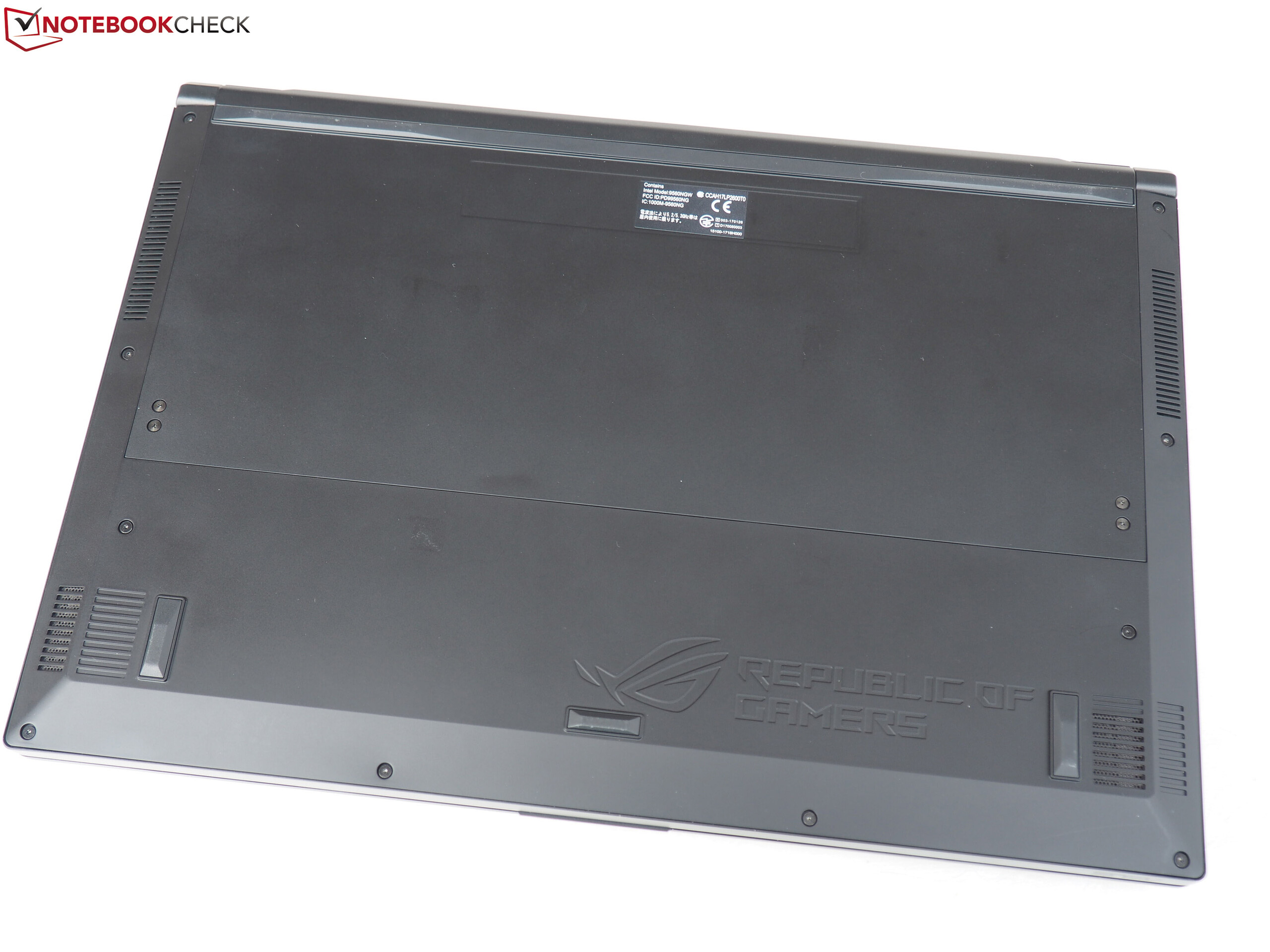 Uno degli aspetti più unici del GX501, il sollevamento della parte inferiore della base all'apertura del dispositivo (che dovrebbe migliorare il raffreddamento) è stato mantenuto nel GM501. Questo "trucco" permette a Asus di mettere una GPU molto potente in un caso sorprendentemente sottile. Con un'altezza di soli 2,0 cm (~ 0,78 pollici), il dispositivo da 15 pollici è uno dei notebook da gioco più sottili attualmente disponibili. Il suo peso di soli 2,5 kg (~5,5 lb) è anche molto basso per un dispositivo di fascia alta, anche se gli altri dispositivi del nostro campo di confronto pesano ancora meno (il MSI GS63VR pesa solo 1,9 kg/~4,2 lb).