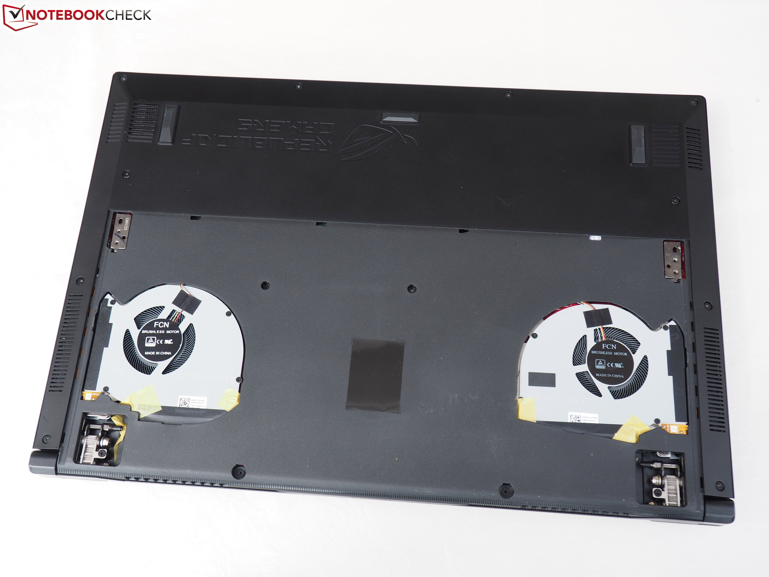 Dopo aver fatto questo (anche i dilettanti dovrebbero riuscire), l'hardware è facilmente accessibile: dai due slot RAM tramite il modulo wireless e la batteria ai dispositivi di memorizzazione (1x M.2 e 1x 2,5 pollici). Il sistema di raffreddamento è costituito da due ventilatori circondati da quattro dissipatori ciascuno. Poiché la CPU e la GPU sono saldate alla scheda madre, non è possibile aggiornare questi componenti principali. Questo è lo stesso per quasi tutti i notebook.