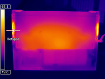 Anche se il dispositivo da 15 pollici non è uno dei notebook di gioco più freschi, le sue temperature sono per lo più accettabili. Anche se si consiglia di non mettere lo Zephyrus M sulle gambe durante il gioco (fino a 49 °C / ~ 120 °F sul fondo dell'unità base), un massimo di 41 °C (~ 105,8 °F) nell'area WASD sono gestibili anche durante le sessioni di gioco lunghe.