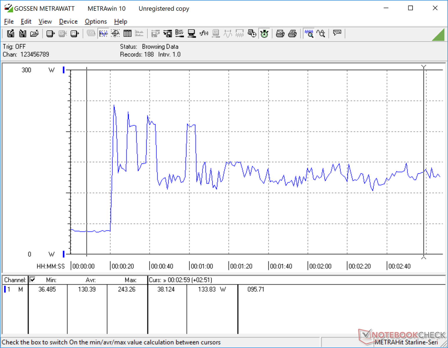 Il sistema consuma da 26 W a 32 W al minimo sulla scrivania, a seconda del profilo di potenza e del livello di luminosità predefinito. L'esecuzione di Witcher 3 richiede circa 192 W risultando molto simile all'Aorus X7 v7 con la stessa GPU. Il consumo di energia durante il carico massimo (Prime95+FurMark) è inferiore al carico di Witcher 3 a causa del throttling che si verifica come mostrato nella tabella seguente.