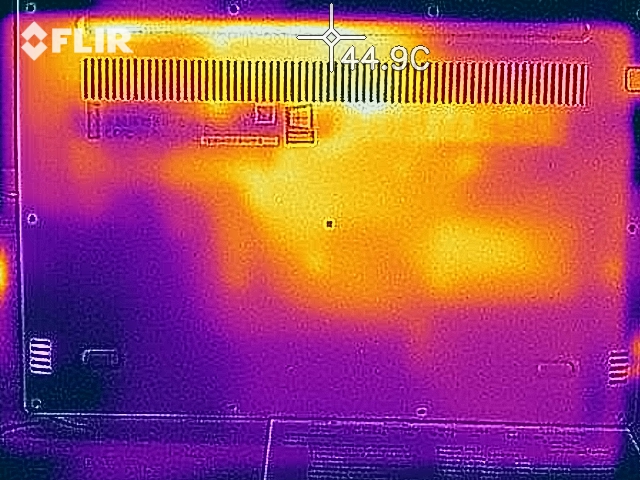 Sfortunatamente, l'IdeaPad 720 è peggiore nel gestire le temperature superficiali sotto carico. La distribuzione del calore non è uniforme. Le temperature superficiali del case sono in media di 33,2 °C sotto carico, mentre la parte più calda raggiunge i 41,2 °C. L'area più calda è il centro e il lato sinistro della tastiera, mentre l'area del poggiapolsi e del trackpad è in media di 25,6 °C.
