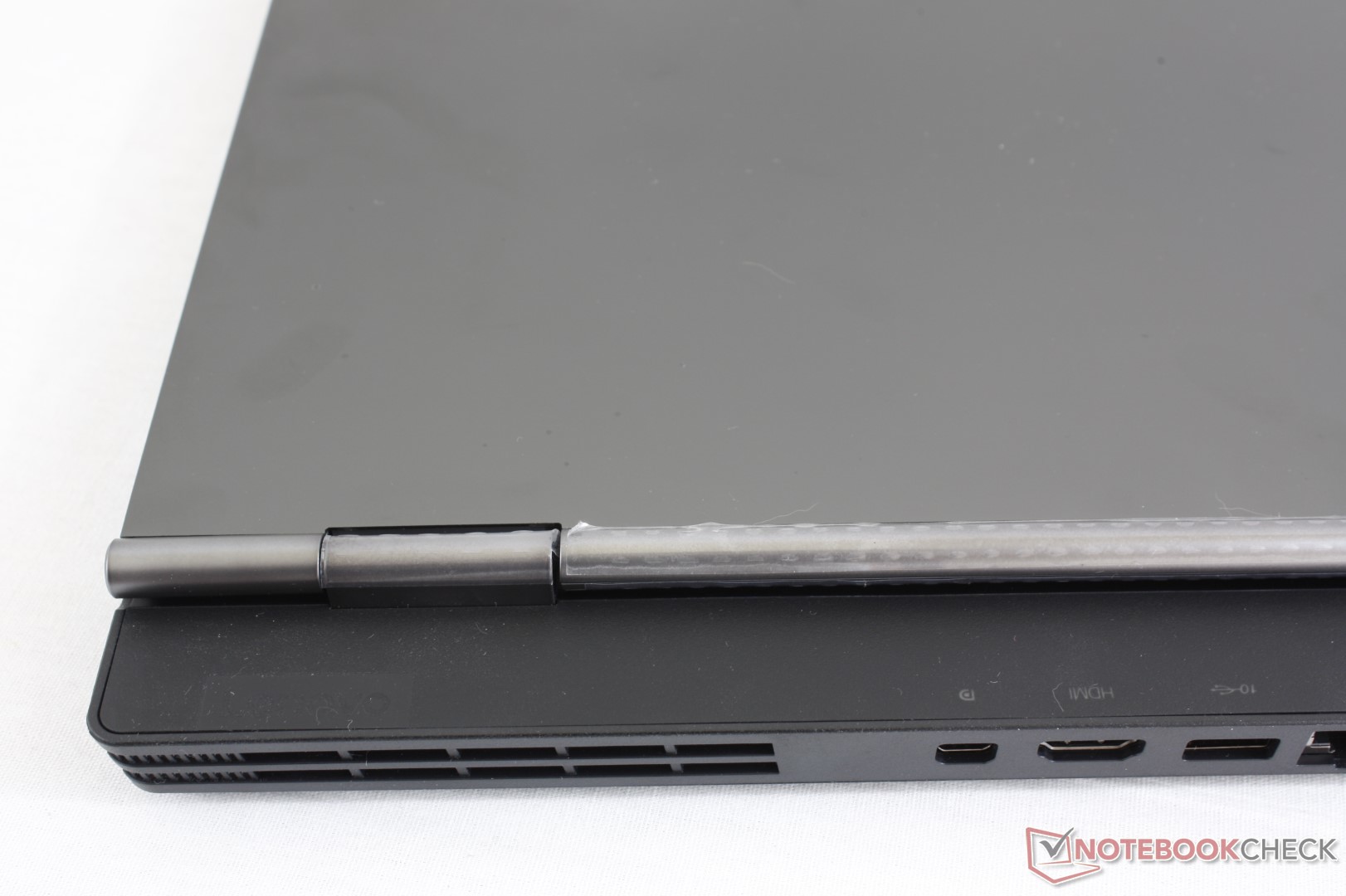 La qualità del telaio è qualcosa di misto. La cover, in particolare, è significativamente più flessibile rispetto quelle di XPS 15, Razer Blade 15, Gigabyte Aero 15, MSI GF63, e la maggior parte degli altri computer portatili da 15 pollici da gioco. Questo è probabilmente dovuto alle cornici strette, alla mancanza di rinforzi in Gorilla Glass e al materiale della cover esterna apparentemente più sottile. Le doppie cerniere sono decenti con una gamma molto ampia, ma il coperchio oscilla ancora un po' quando si regola l'angolazione o si trasporta il laptop.