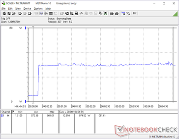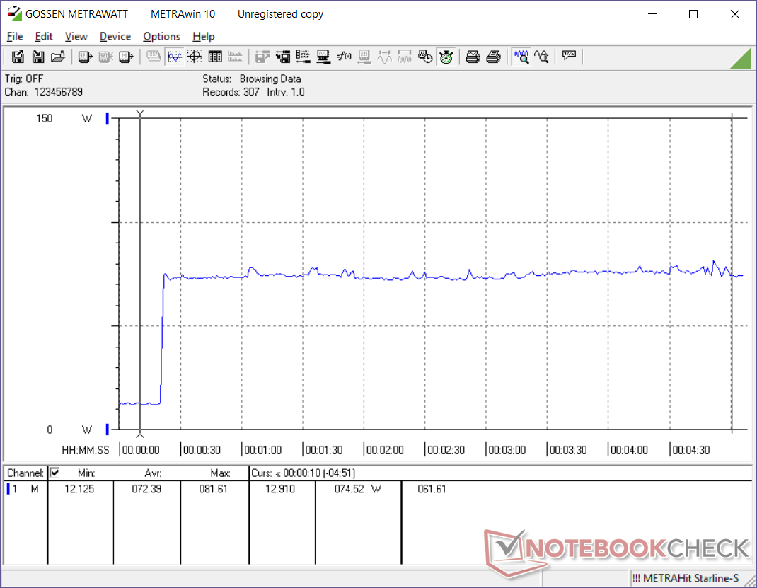 L'utilizzo su desktop richiede una potenza compresa tra 8 W e 13 W a seconda dell'impostazione di luminosità e del profilo di potenza, risultando solo un po' più elevata rispetto ai concorrenti MSI GF63 e Asus TUF FX504 con grafica GTX 1050. Se si gioca, il consumo energetico è di circa il 10-15 per cento superiore a ciascuno di questi computer portatili di cui sopra. Se si considera che la GTX 1050 Ti è circa il 25% più veloce del GTX 1050, il consumo leggermente superiore è un compromesso equo dal punto di vista delle prestazioni per Watt.