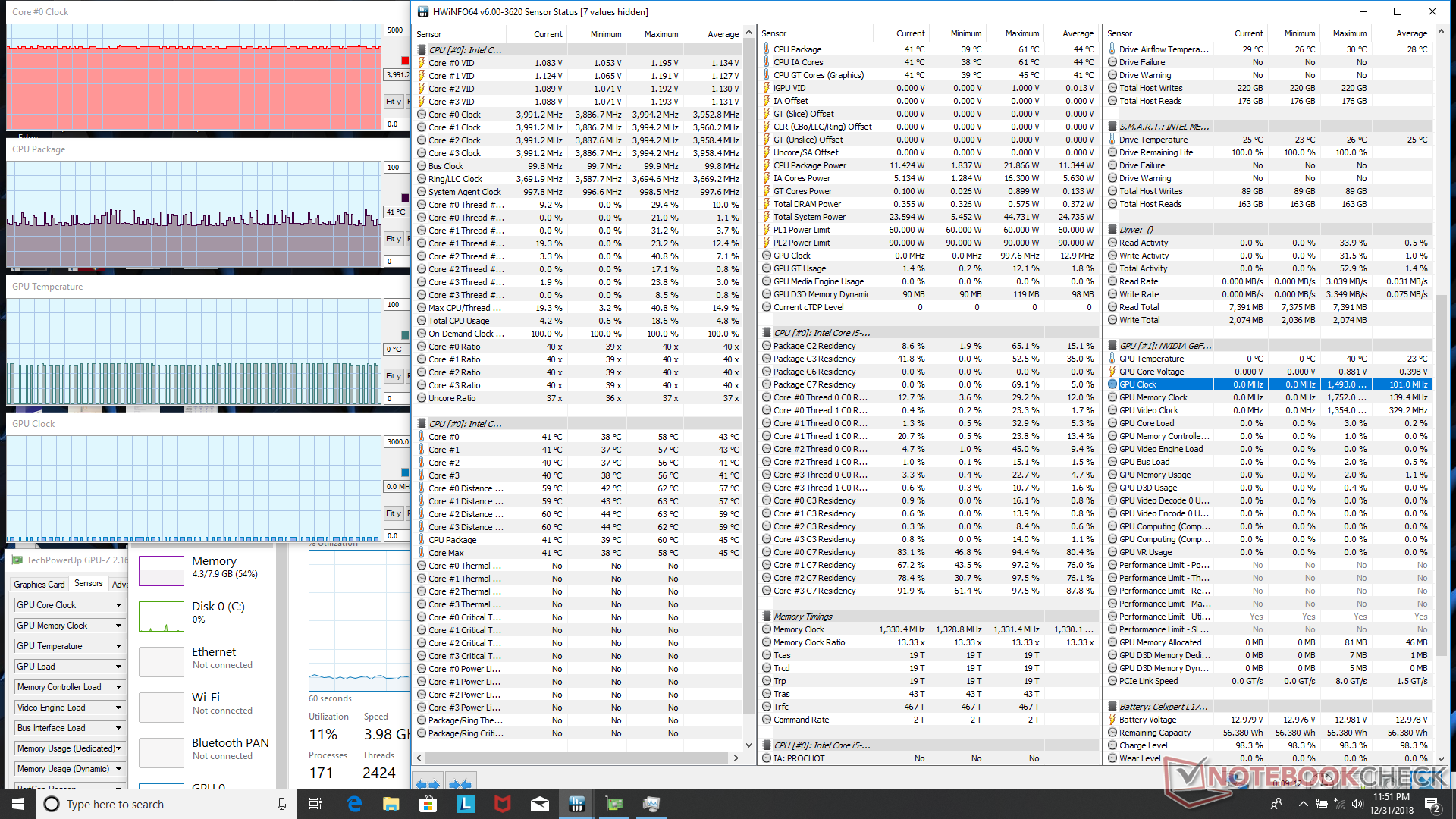 L'alimentazione a batteria ridurrà le prestazioni sia della CPU che della GPU. Un 3DMark 11 a batterie restituisce punteggi Physics e Graphics di 6308 e 6388 punti, rispettivamente, rispetto a 8324 e 9805 punti quando sulla rete elettrica. I frame rate si esauriscono automaticamente a 30 FPS se si gioca con la batteria.