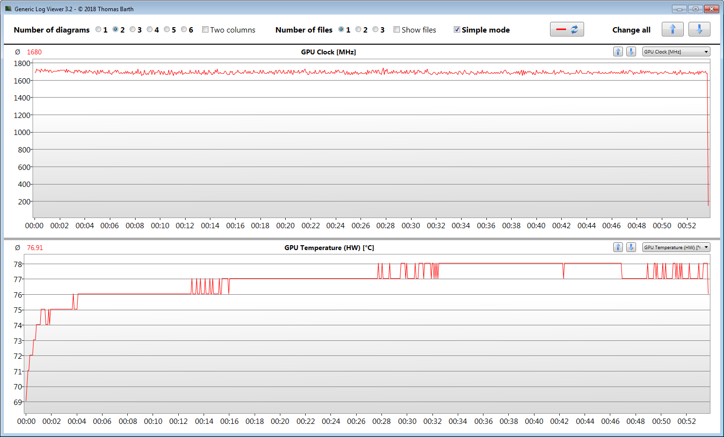 Le nostre prove di stress, in cui Prime95 e FurMark funzionano per almeno un'ora, danno risultati diversi. Nella gestione di rete, la CPU opera a velocità di clock comprese tra 2,9 e 3,0 GHz e la GPU a velocità di clock comprese tra 1.400 e 1.500 MHz. In modalità batteria, la velocità di clock scende a 800 MHz per il processore e a 139 MHz per il core grafico.