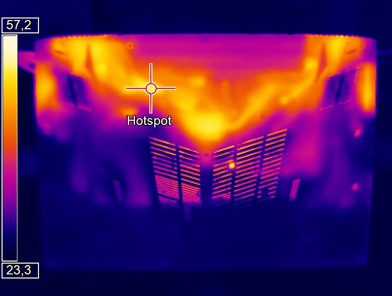 Se si considera l'energia elettrica del GE73, la generazione di calore è abbastanza entro i limiti. Durante la prova da sforzo si registrano temperature comprese tra 45 e 49 °C (da 113 a 120 °F) in diversi punti all'esterno del telaio. L'aumento di temperatura durante il nostro test The Witcher 3 (il gioco si svolge per un'ora con risoluzione Full-HD e il massimo dei dettagli) è leggermente inferiore.