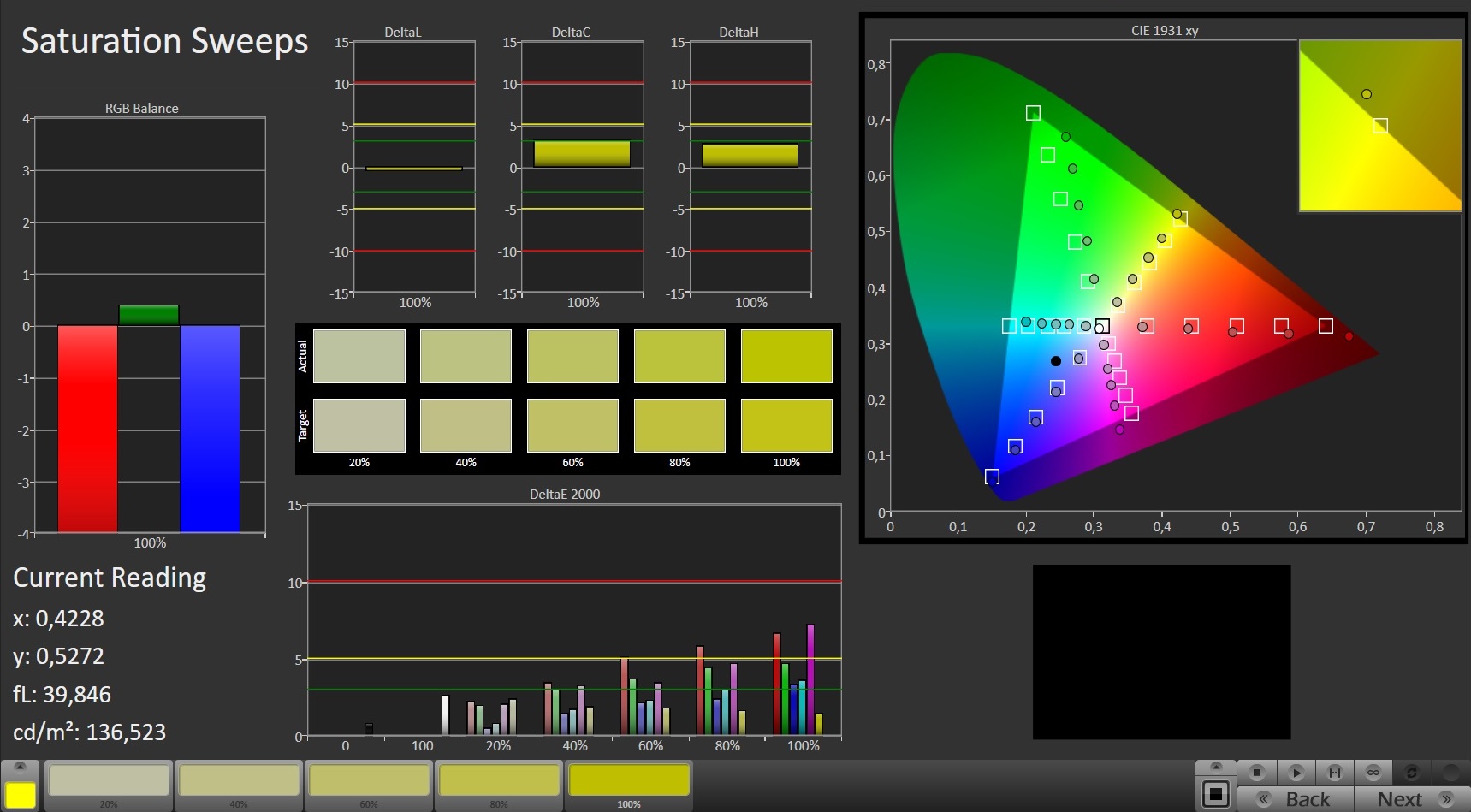 | Colorchecker dE 2000 max. * | 7.29 | 14.4 -98% | 6.34 13% | 10.54 -45% | 9.33 -28% |