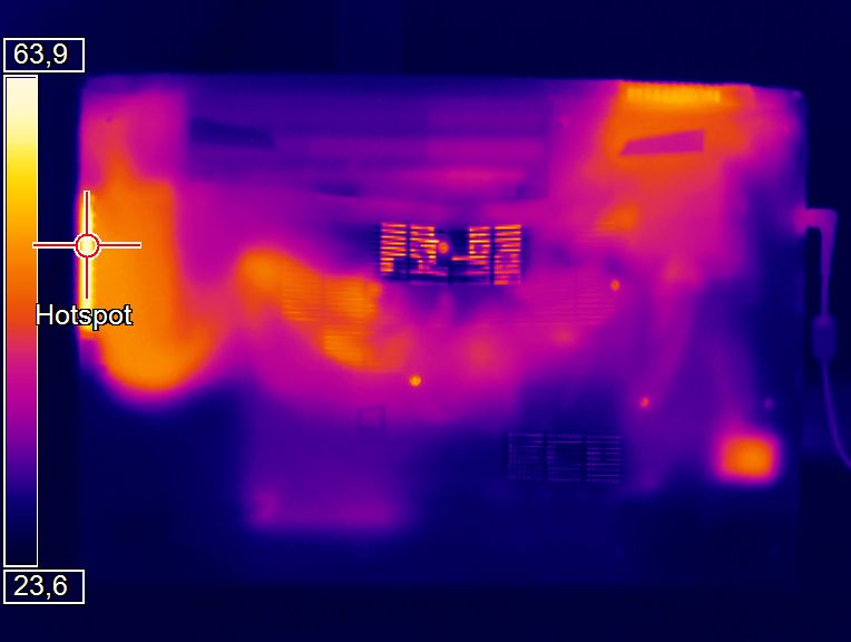 Come il rumore di fondo, anche le temperature del computer portatile si rivelano moderate. In verità, in situazioni estreme il case supera i 50°C (122°F) in un punto, ma i tasti WASD e il poggiapolsi non si riscaldano immoderatamente. In modalità inattiva, la maggior parte dei casi rimane piacevolmente fredda; solo pochi punti si riscaldano oltre i 30° C (86°F).