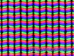 La matrice di sub-pixel appare un po' sgranata se osservata da vicino. È interessante notare che la matrice in modalità UHD+ appare piuttosto nitida e ben definita. Ci si aspetterebbe una dimensione maggiore dei pixel quando si passa alla modalità FHD+, ma qui vediamo pixel di dimensioni identiche.