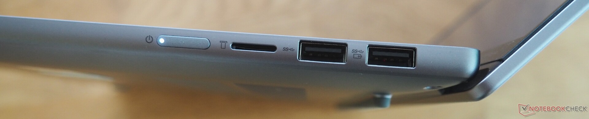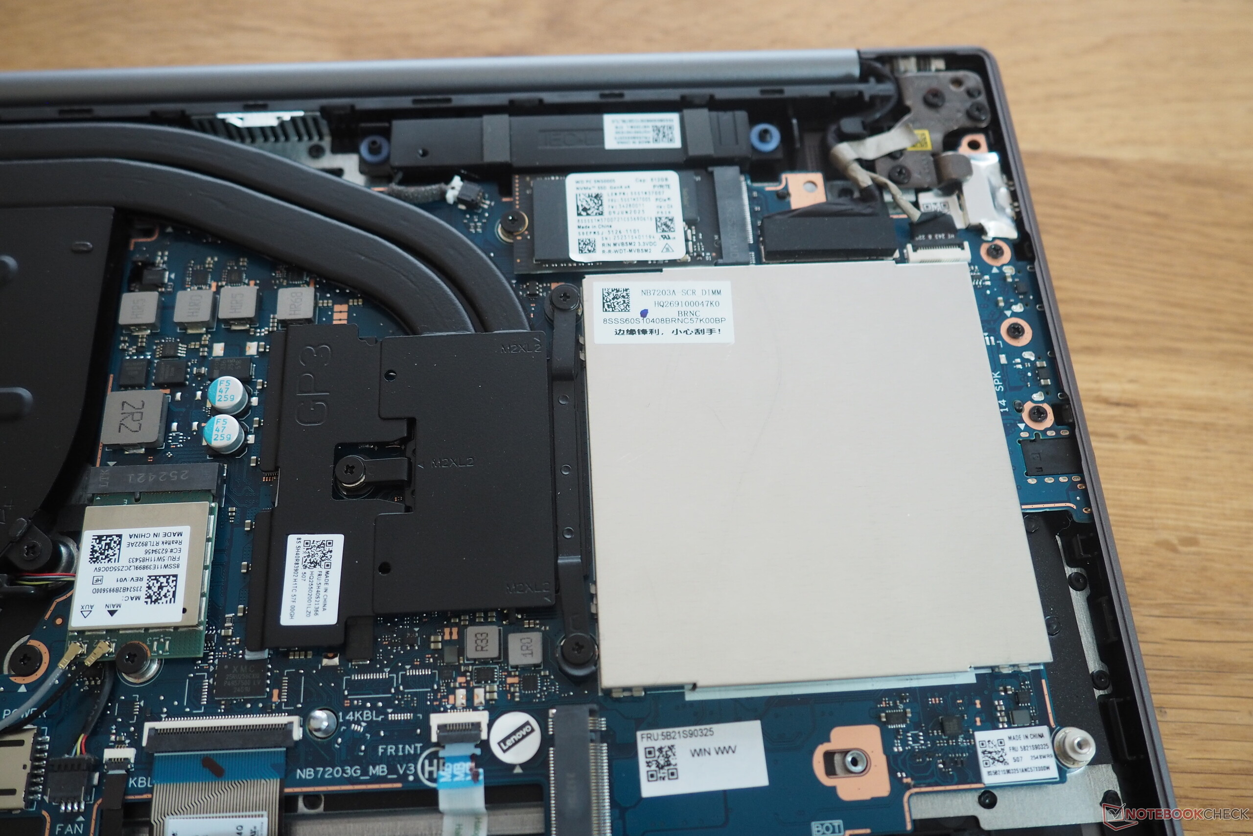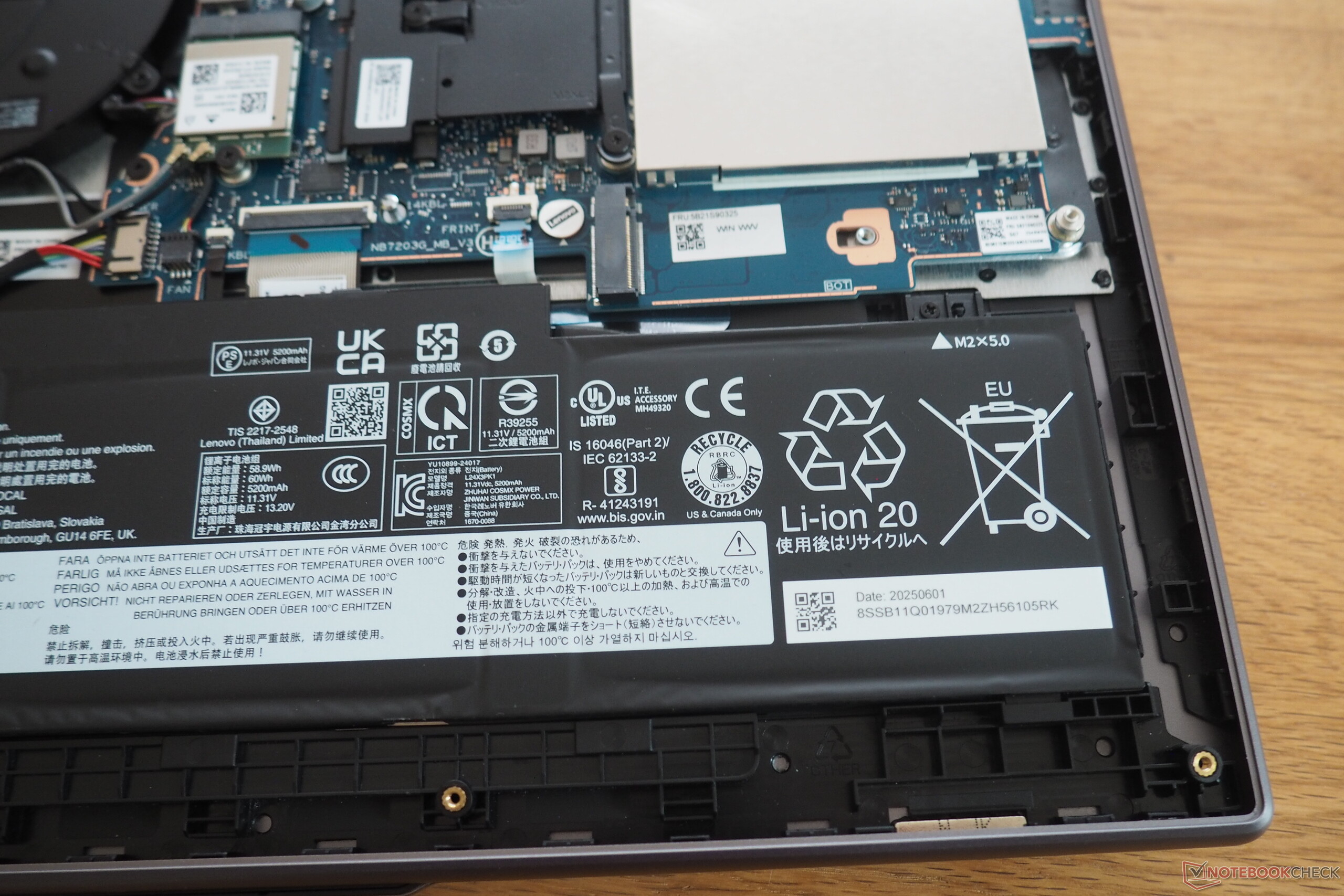 Sul lato sinistro, si trovano due porte USB-C 3.1 Gen 2 con supporto DisplayPort 1.4 e PowerDelivery, oltre a un'uscita HDMI e un jack audio combinato. Il lato destro ospita un lettore di schede microSD ragionevolmente veloce e due porte USB-A 3.0 convenzionali. Non è inclusa una porta Ethernet, ma il portatile è dotato di un modulo Wi-Fi 7 molto veloce. La webcam, che include un otturatore per la privacy, offre una risoluzione di soli 0,9 MP, ma produce comunque un'immagine più nitida rispetto a molti modelli concorrenti. Il coperchio inferiore è facile da rimuovere dopo aver svitato sei viti Torx. All'interno, troverà due slot SO-DIMM occupati e due slot M.2. Lo slot 2280 è libero, mentre l'SSD installato si trova nello slot 2242, più piccolo.