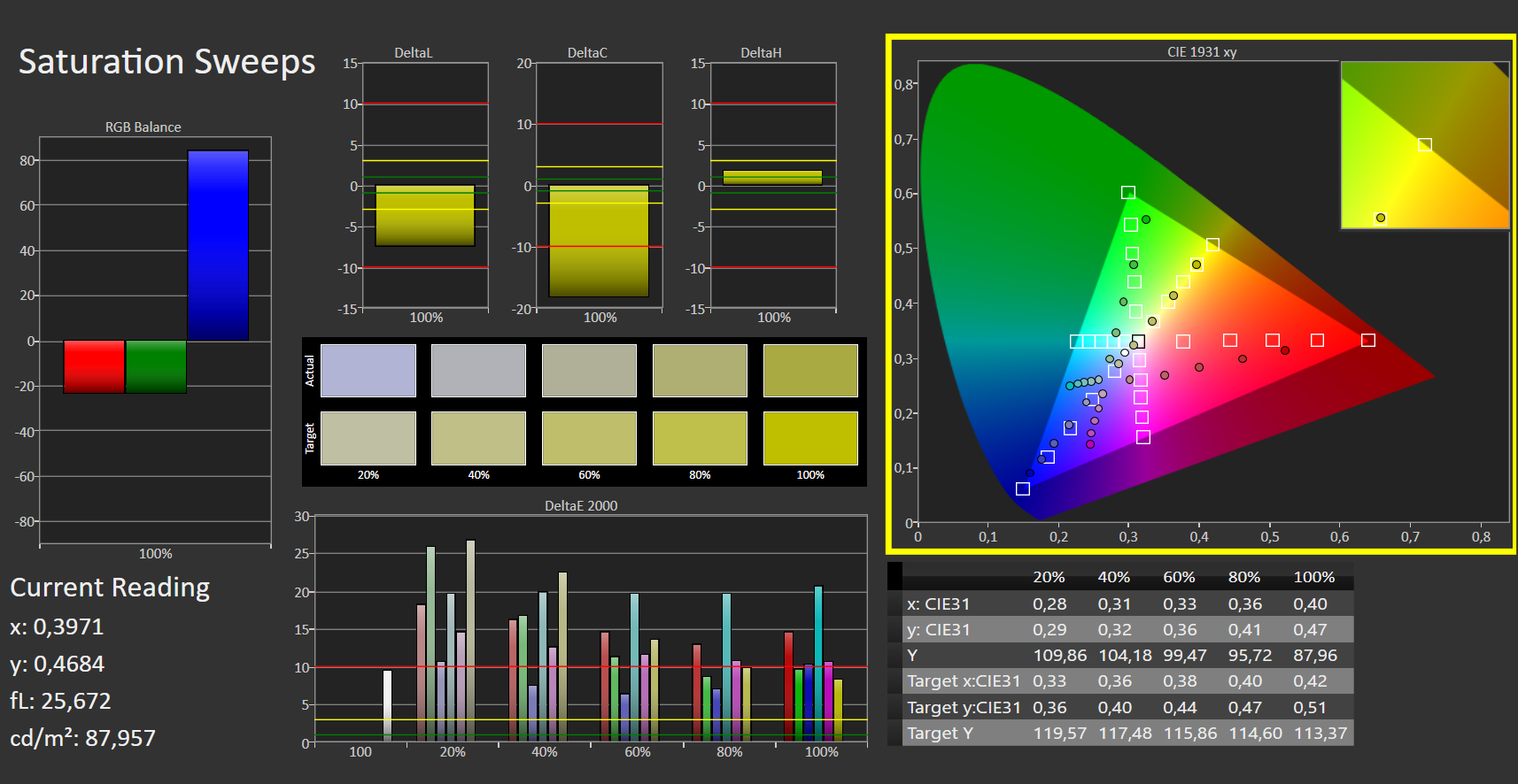 L'analisi CalMAN mostra anche che i colori sono visualizzati con una evidente sfumatura blu.