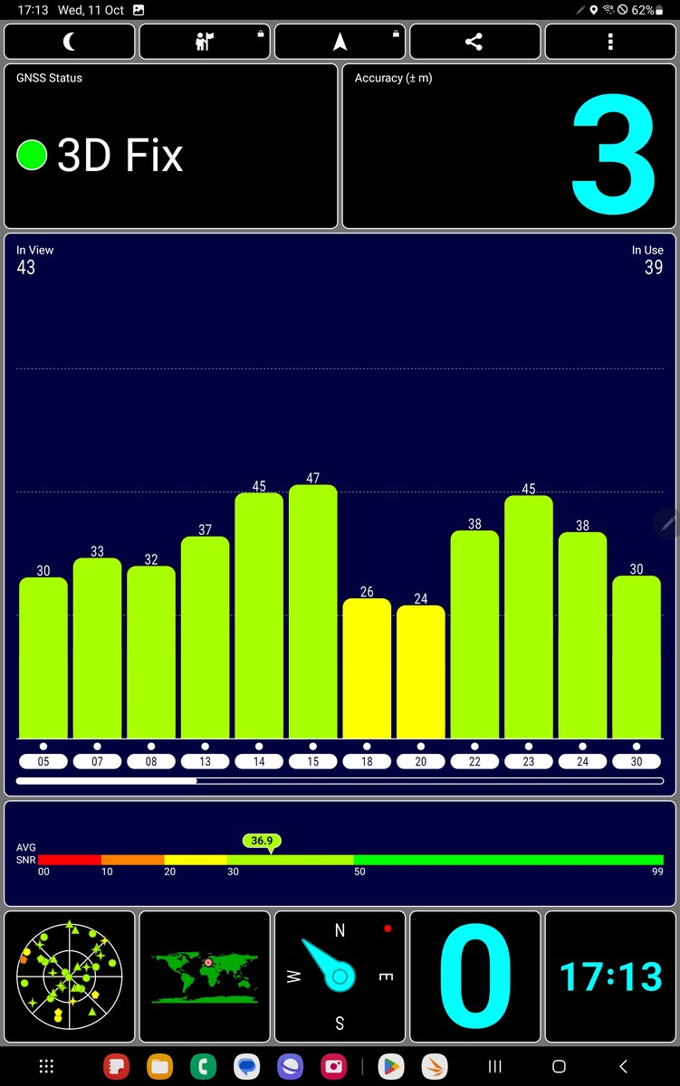 All'interno, è difficile ottenere un segnale satellitare, quindi la maggior parte delle volte, la posizione approssimativa viene determinata utilizzando i servizi Google con l'aiuto di connessioni WLAN conosciute. Tuttavia, nel momento in cui si esce all'esterno, l'uplink satellitare funziona molto rapidamente e siamo localizzati con una precisione di 3 metri (~10 ft). Ma anche in questo caso, il tablet non trova molti satelliti.