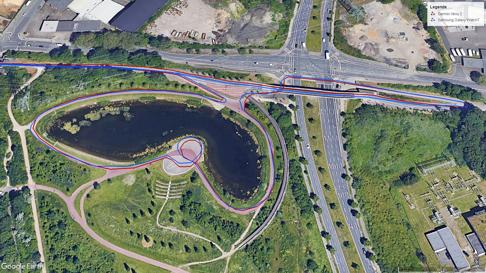 Il risultato della registrazione GPS dello smartwatch Galaxy è molto convincente. La distanza misurata dai due orologi differisce solo marginalmente e la visualizzazione del percorso effettuato mostra solo lievi differenze.