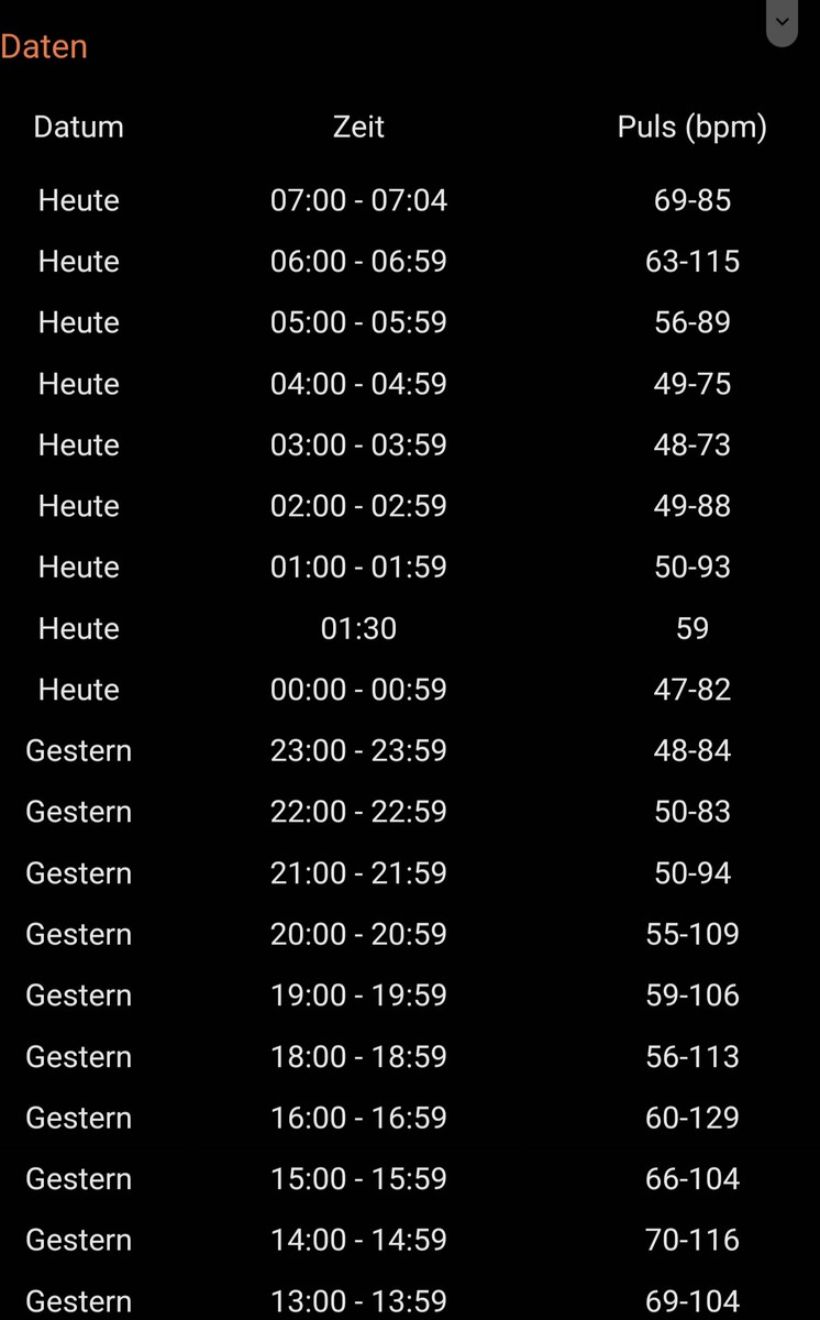 È un peccato che i valori registrati in modo permanente per le pulsazioni e l'ossigeno nel sangue durante la notte siano visualizzati solo in un intervallo di fluttuazione. Anche l'esportazione è limitata a questo pacchetto di dati molto limitato. Di conseguenza, è difficile valutare lo sviluppo dei valori del polso per un giorno/una notte. Nel caso dell'ossigeno nel sangue di notte, la mancanza di un'opzione di esportazione rende difficile anche la lettura di misurazioni errate, il che rende molto più difficile la valutazione.