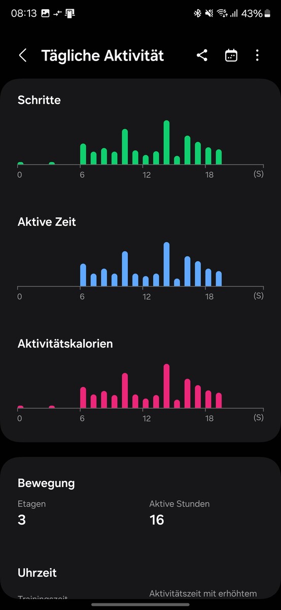I dati raccolti dal Galaxy Watch7 non vengono registrati nell'applicazione Wear; a tale scopo è necessario scaricare l'applicazione Samsung Health dal PlayStore. I dati relativi ai passi, alla frequenza cardiaca, ai valori del sonno, all'allenamento, all'ECG e alla pressione sanguigna, nonché alla composizione del corpo in termini di massa muscolare, grasso e acqua, vengono raccolti nel menu iniziale dell'applicazione.