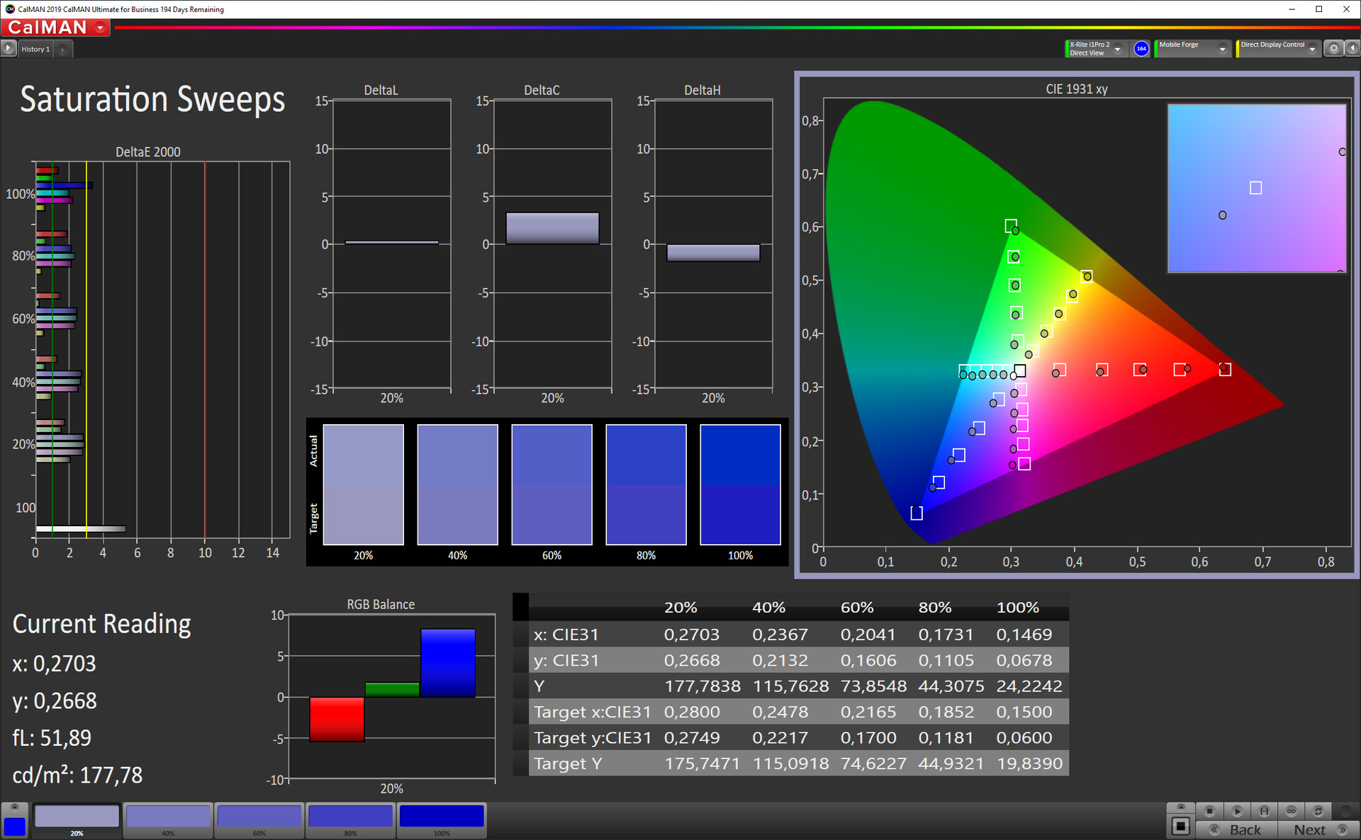 | Colorchecker dE 2000 max. * | 5.5 | 1.98 64% | 5.4 2% | 5.17 6% | 10.4 -89% |