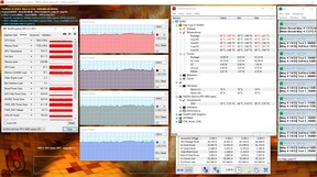All'inizio del nostro stress test (Prime95 e FurMark in esecuzione continua per almeno un'ora), il processore operava a 4.2 GHz e la GPU a 1425 MHz. Dopo poco tempo, la CPU ha raggiunto i 90 °C (194 °F) e ha iniziato a ridurre la velocità per mantenersi all'interno del range operativo conservativo impostato da Acer. Nel frattempo, le temperature della GPU sono salite lentamente a 79 °C (174,2 °F). Alla fine, i clock della GPU si sono assestati intorno agli 800 MHz, saltuariamente raggiungendo i 1400 MHz. Nel corso del nostro stress test, la frequenza media di clock della CPU ammontava a 3,4 GHz e la frequenza media di clock della GPU era di 1040 MHz.