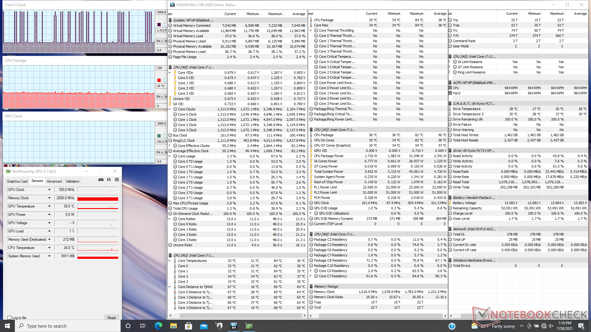 Sottoposta a stress con Prime95, la CPU raggiunge i 4,3 GHz solo per uno o due secondi prima di raggiungere una temperatura del core di 100° C. La frequenza di clock sarebbe poi rapidamente scesa ad un più stabile range di 2,1 GHz per mantenere una temperatura del core più fredda di circa 83° C. Eseguendo questo stesso test sul MSI Summit E14 equipaggiato con la stessa CPU Core i7 risulterebbe in frequenze di clock più veloci e temperature del core più calde di 3.0 GHz e 91° C, rispettivamente. È probabile che HP avrebbe potuto aumentare le prestazioni alzando il tetto del rumore della ventola.