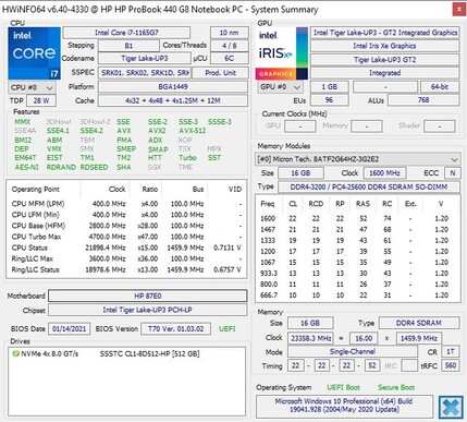 | HP ProBook 440 G8-2W1G4EA i7-1165G7, Iris Xe G7 96EUs, Lite-On CL1-8D512, VA, 1920x1080, 14" | HP ProBook 440 G6-5TK01EA i7-8565U, UHD Graphics 620, Toshiba XG5 KXG50ZNV512G, IPS, 1920x1080, 14" | Dell Inspiron 14 7400-VY8JW i7-1165G7, GeForce MX350, Samsung PM981a MZVLB1T0HBLR, IPS, 2560x1600, 14.5" | Lenovo ThinkPad E14 Gen2-20TA000DGE i7-1165G7, Iris Xe G7 96EUs, Lenovo UMIS AM620 RPJTJ512MEE1OWX, IPS LED, 1920x1080, 14" | Media Intel Iris Xe Graphics G7 96EUs | Media della classe Office | |