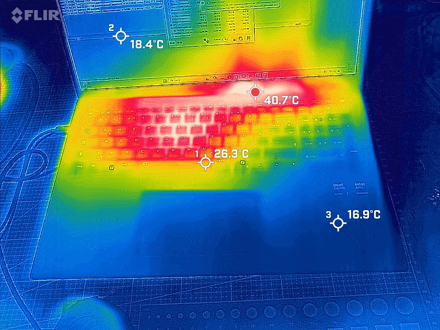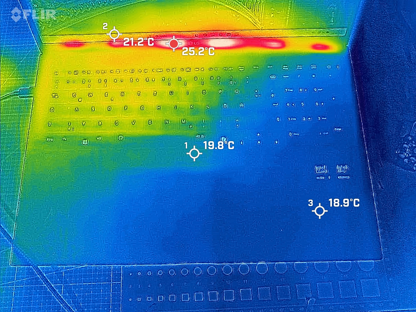 Lo sviluppo della temperatura dipende chiaramente dalla modalità di prestazione selezionata. Soprattutto nel funzionamento "silenzioso", l'involucro si riscalda sensibilmente nel tempo, fino a quando le ventole non intervengono (rimanendo appena udibili). Anche nei test di stress con le massime prestazioni di raffreddamento, il Gram non rimane esattamente fresco.