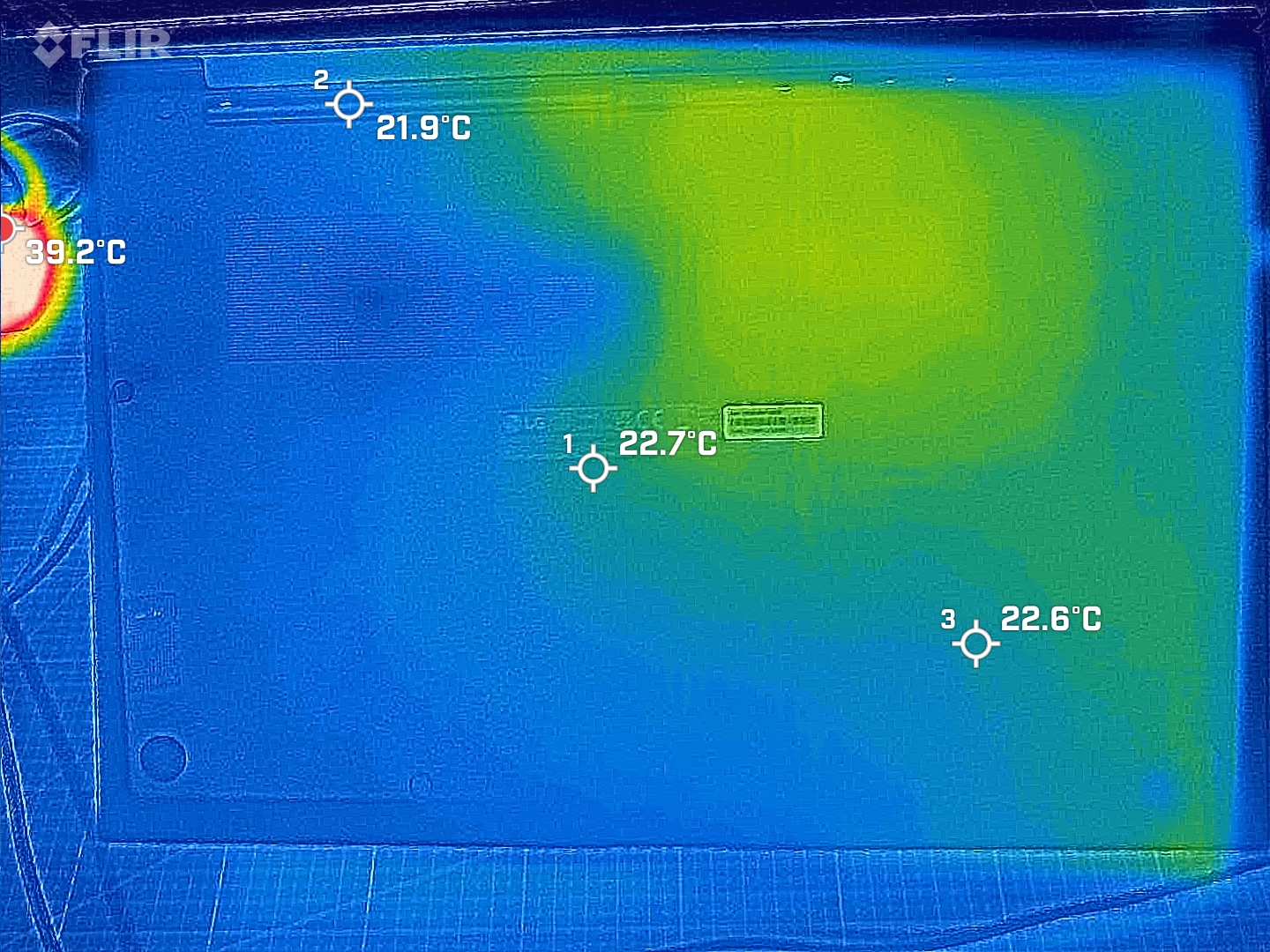 (+) In idle, la temperatura media del lato superiore è di 20.5 °C / 69 F, rispetto alla media deld ispositivo di 29.5 °C / 85 F.