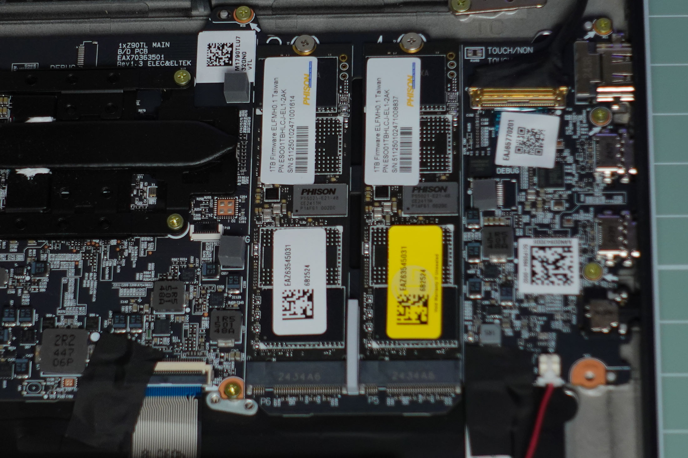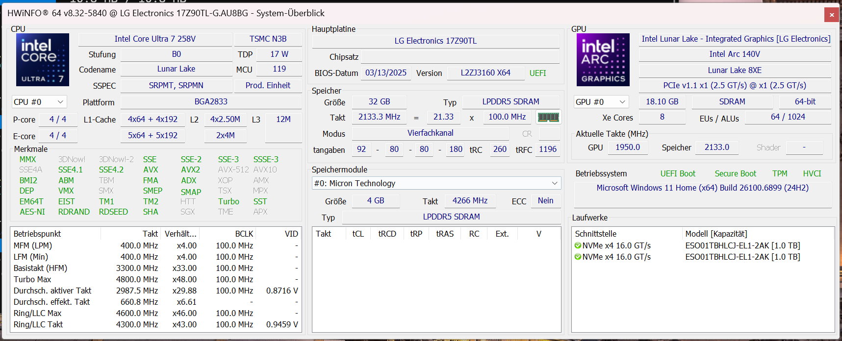 Con Lunar Lake, Intel sta aprendo nuove strade nella progettazione dei processori. Il focus è meno sul multi-threading e molto più sull'efficienza energetica superiore. La RAM è integrata direttamente nel pacchetto del processore con queste CPU, il che limita le configurazioni di memoria disponibili. Attualmente, i modelli Gram con processori Lunar Lake sono disponibili solo con il Core Ultra 7 256V o 258V. Ciò si traduce in configurazioni con 16 GB o 32 GB di RAM. La nostra unità di prova utilizza la configurazione da 32 GB. Inoltre, sul mercato sono disponibili diverse configurazioni di archiviazione. Il nostro dispositivo era dotato di due SSD NVMe, ciascuno dei quali forniva 1 TB di spazio di archiviazione.
