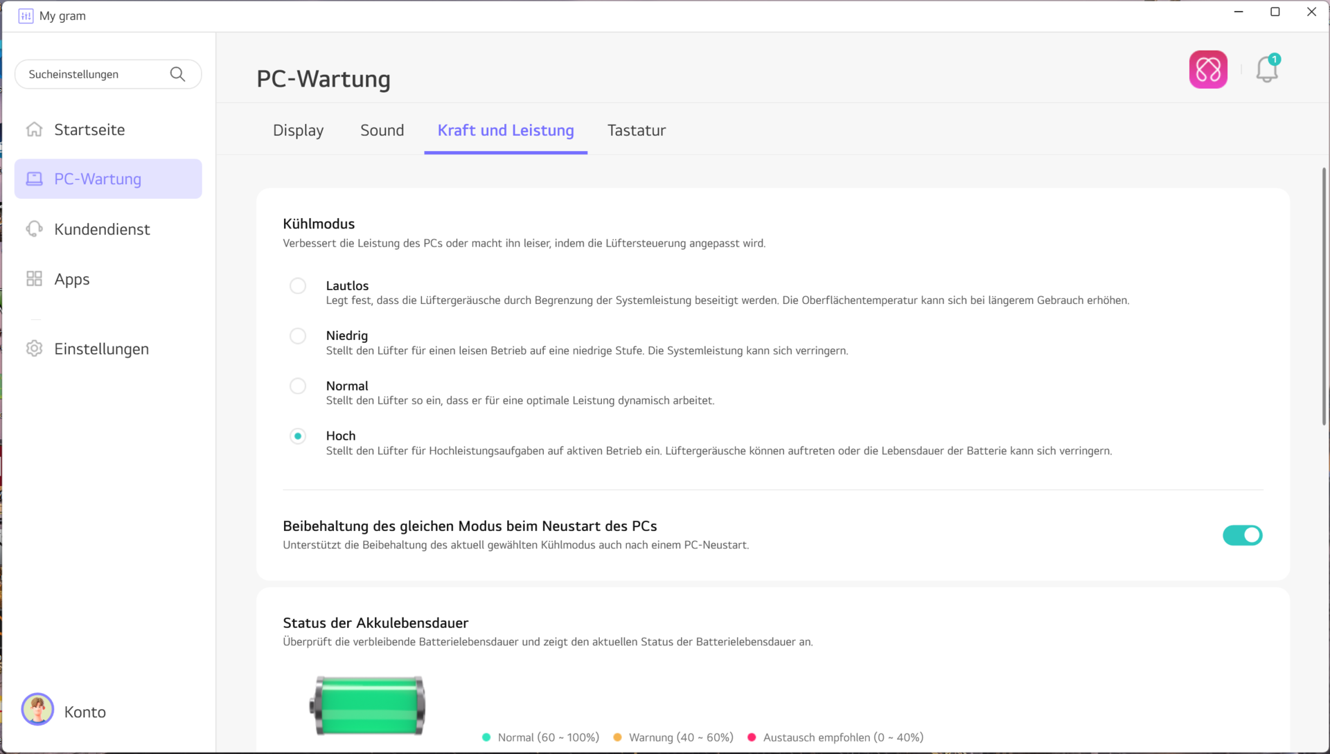 Nell'applicazione MyGram, sono preconfigurati quattro diversi profili di prestazioni. Queste preimpostazioni vanno da ventole (quasi) silenziose a un utilizzo elevato delle ventole. Tuttavia, durante le misurazioni del rumore dello stress test, abbiamo scoperto che in scenari impegnativi, l'impostazione "Normale" e la modalità di raffreddamento "Alta" differiscono solo di uno o due dB(A). Per questo motivo, abbiamo scelto di utilizzare la modalità di raffreddamento più forte per tutti i nostri benchmark e misurazioni.