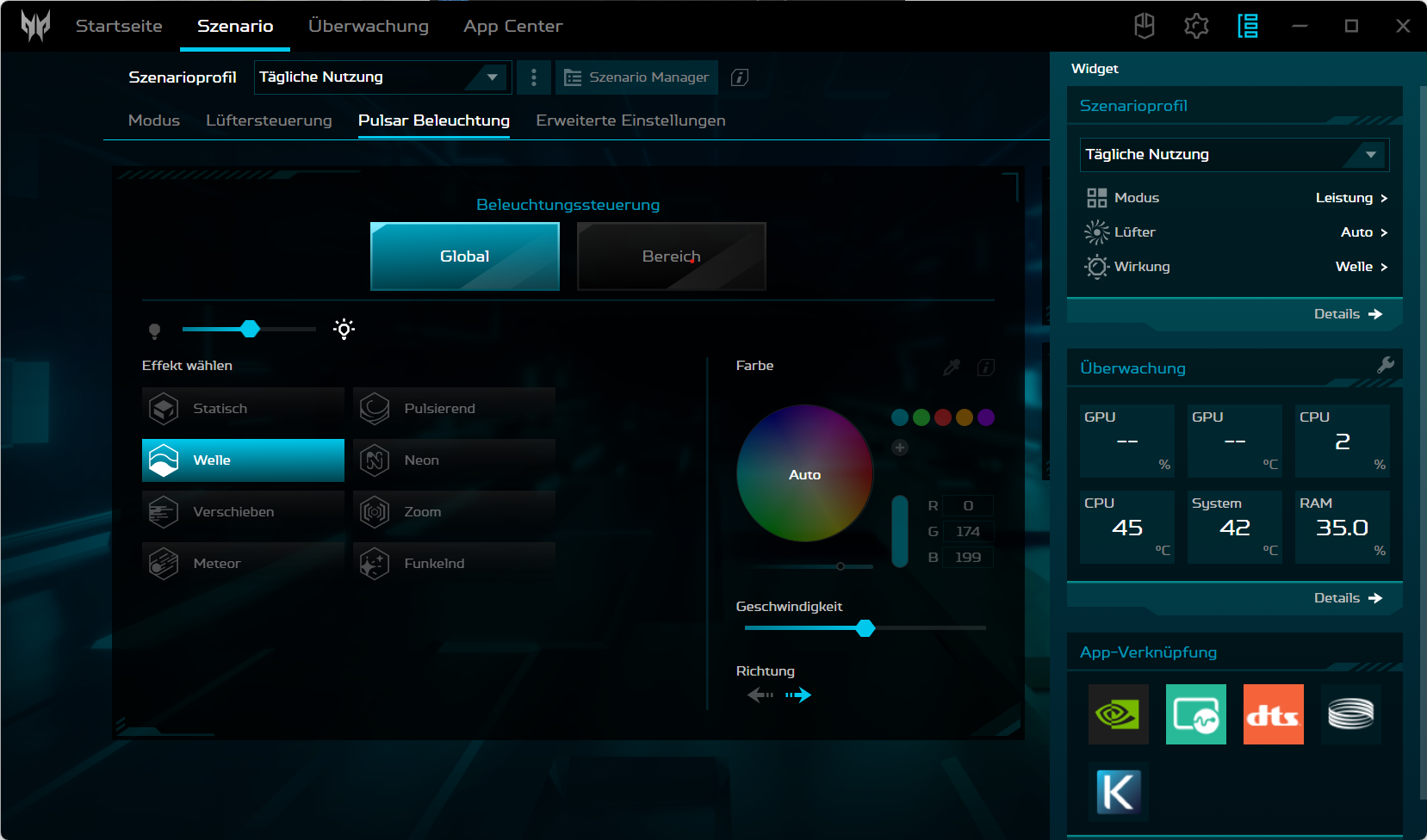 Acer ha dotato questa tastiera di un'illuminazione RGB a quattro zone con quattro livelli di intensità, mentre la versione non-Neo ha un'illuminazione micro-LED particolarmente uniforme. Mentre il pulsante con il logo sul tastierino numerico lancia l'applicazione Predator Sense, il pulsante illuminato in modo permanente in alto a sinistra viene utilizzato per passare da una modalità all'altra.