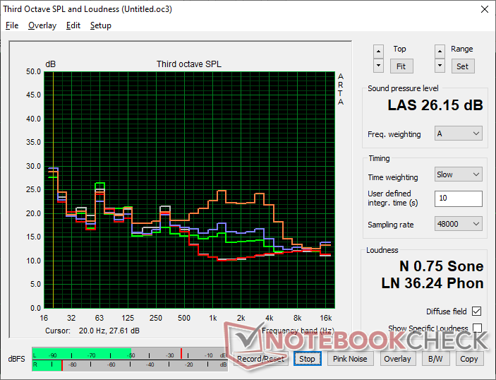 Gli altoparlanti quadrupli sono di qualità eccellente nonostante le dimensioni ridotte. Le nostre misurazioni al microfono li hanno rivelati molto forti, con quasi 89 dB(A) e un'ampia curva di rumore rosa per un'ampia gamma di riproduzione. Gli altoparlanti funzionano bene sia per le videochiamate che per i contenuti multimediali.