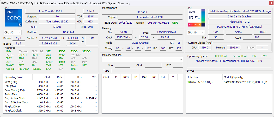 | HP Elite Dragonfly Folio 13.5 G3 i7-1265U, Iris Xe G7 96EUs, 53 Wh | HP Elite Dragonfly G3 i7-1265U, Iris Xe G7 96EUs, 68 Wh | Dell Latitude 13 7330 i7-1265U, Iris Xe G7 96EUs, 41 Wh | Framework Laptop 13.5 12th Gen Intel i7-1260P, Iris Xe G7 96EUs, 55 Wh | Razer Book 13 FHD i7-1165G7, Iris Xe G7 96EUs, 55 Wh | Lenovo ThinkPad L13 Gen2-20VH0017GE i5-1135G7, Iris Xe G7 80EUs, 46 Wh | |