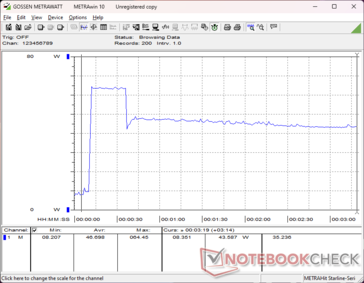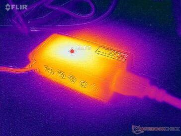 Siamo riusciti a registrare un consumo massimo temporaneo di 65 W dal piccolo (~9 x 4,7 x 2,7 cm) adattatore CA USB-C da 65 W quando la CPU è al 100 percento di utilizzo.