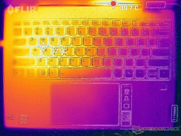 Le temperature di superficie sono più calde nella metà sinistra dello chassis rispetto a quella destra, con le aree più calde e più fredde che raggiungono rispettivamente 38 C e 27 C. La regione calda è purtroppo vicina ai tasti WASD, il che è sfavorevole quando si gioca o si digita. In confronto, il Dell Inspiron 14 7445 2-in-1 ha la sua regione più calda vicino al centro della tastiera, dove i palmi delle mani e le dita non si appoggiano. Tuttavia, non abbiamo mai trovato che il Lenovo fosse scomodamente caldo durante l'uso.
