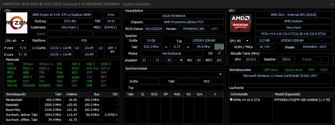 | 84.9 % | v8 | 08/2024 | Asus VivoBook S 14 OLED M5406WA Ryzen AI 9 HX 370, Radeon 890M | 1.3 kg | 15.9 mm | 14.00" | 1920x1200 | |