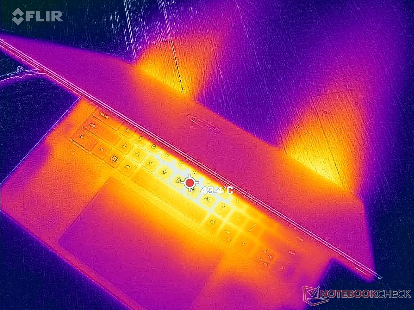Le temperature di superficie sono relativamente calde, intorno ai 30 °C, anche quando il computer è semplicemente al minimo, a causa dell'elevata densità di potenza del sottile chassis. Tuttavia, questo non è diverso dal modello dell'anno scorso, poiché l'involucro di potenza è rimasto più o meno lo stesso. La temperatura della pelle può risultare fastidiosamente calda (45 °C) sul lato inferiore dello chassis quando si eseguono carichi impegnativi come i giochi.