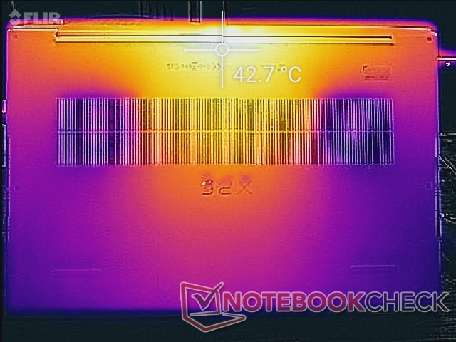 I punti caldi possono raggiungere oltre 52 C e 44 C sui lati superiore e inferiore, rispettivamente, quando si utilizzano carichi stressanti per lunghi periodi. Queste aree si trovano strategicamente verso la parte posteriore dello chassis e lontano dai poggiapolsi e dalla maggior parte dei tasti. La superficie inferiore è comunque molto calda, poiché la piastra inferiore è un unico pezzo di metallo.