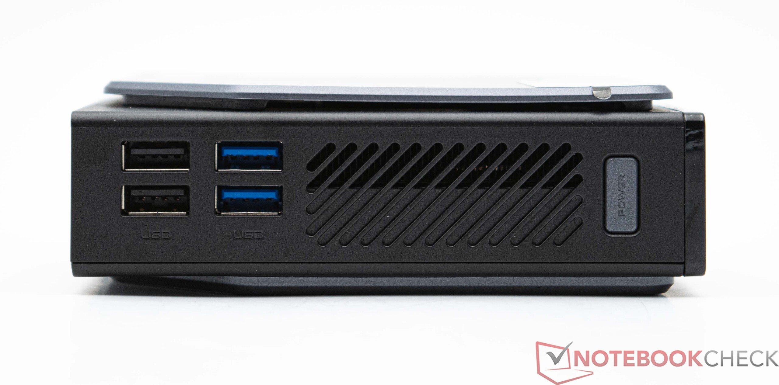 Acemagic S1 è realizzato principalmente in plastica e, nel complesso, il nostro dispositivo di recensione è ben fatto. Sul lato anteriore è integrato un piccolo display che visualizza alcuni dati del mini PC. Acemagic S1 può essere utilizzato sia in verticale che in orizzontale. Il supporto è incluso nella confezione e viene fissato al dispositivo principale tramite un connettore magnetico. Ciò significa che il dispositivo richiede molto meno spazio sulla scrivania. Nell'uso orizzontale, Acemagic S1 ha un ingombro di circa 12,4 x 12,8 centimetri, un po' di più rispetto ad altri mini PC. Tuttavia, con 440 grammi, il nostro dispositivo di recensione (incluso il supporto) non è eccessivamente pesante. Al contrario, senza il supporto, la bilancia segna solo 380 grammi. Non ci sono lamentele reali per quanto riguarda il case stesso. Visto dalla parte anteriore, il lato sinistro è facilmente rimovibile, per accedere alla RAM e all'SSD. Allo stesso tempo, c'è una piccola finestra di visualizzazione che non ha senso, dal momento che non c'è nulla di illuminato all'interno del dispositivo stesso.