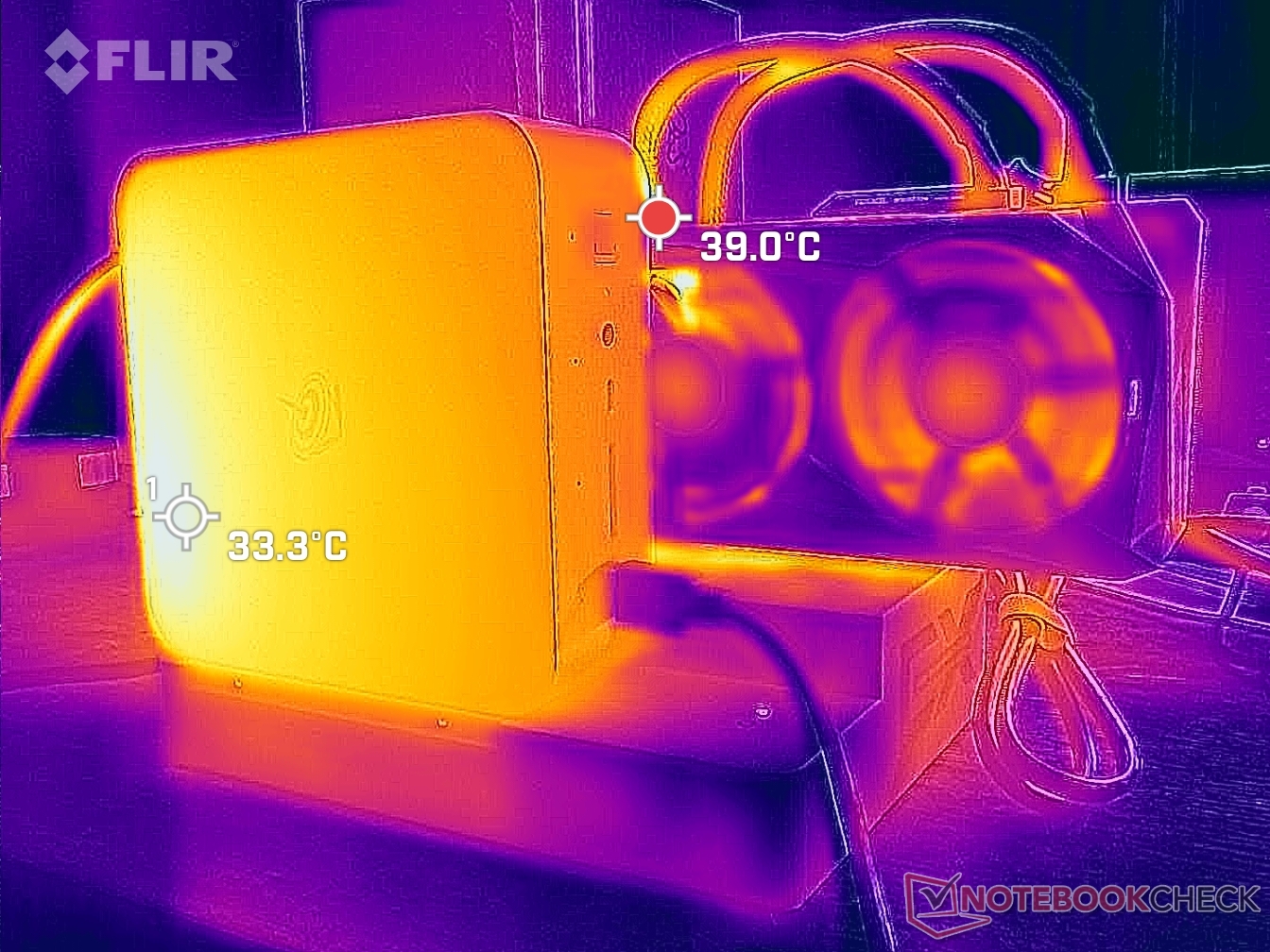 La superficie superiore del mini PC può raggiungere circa 34 C quando si gioca o oltre 41 C quando la CPU è al 100 percento di utilizzo, risultando più calda di molti altri mini PC. Questo è dovuto principalmente al fatto che l'unità integra l'intera PSU all'interno dello chassis e non include griglie di ventilazione lungo i lati.