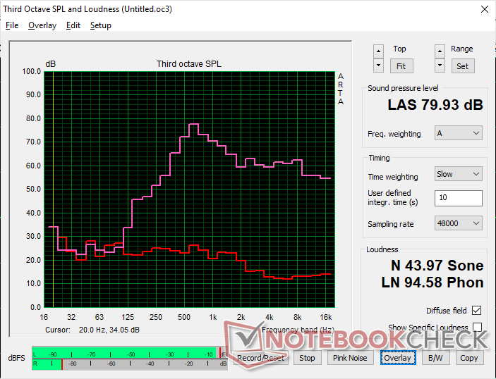 Il rumore della ventola è sempre presente, poiché la ventola dell'alimentatore interno nel dock EX è sempre attiva, anche se le ventole del mini PC e della GPU sono inattive. I livelli di rumore sono generalmente più alti rispetto alla maggior parte degli altri mini PC, a parità di distanza di registrazione di 15 cm, ma la curva di rumore è più ampia e non così netta come quella a cui siamo abituati. Le frequenze di dB più basse sono meno invadenti e più tollerabili rispetto alle ventole solitamente più acute e rumorose dei computer portatili da gioco.