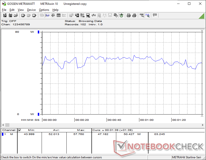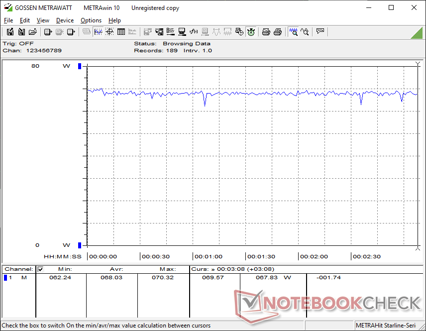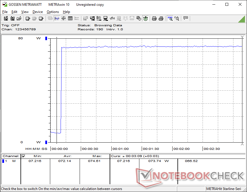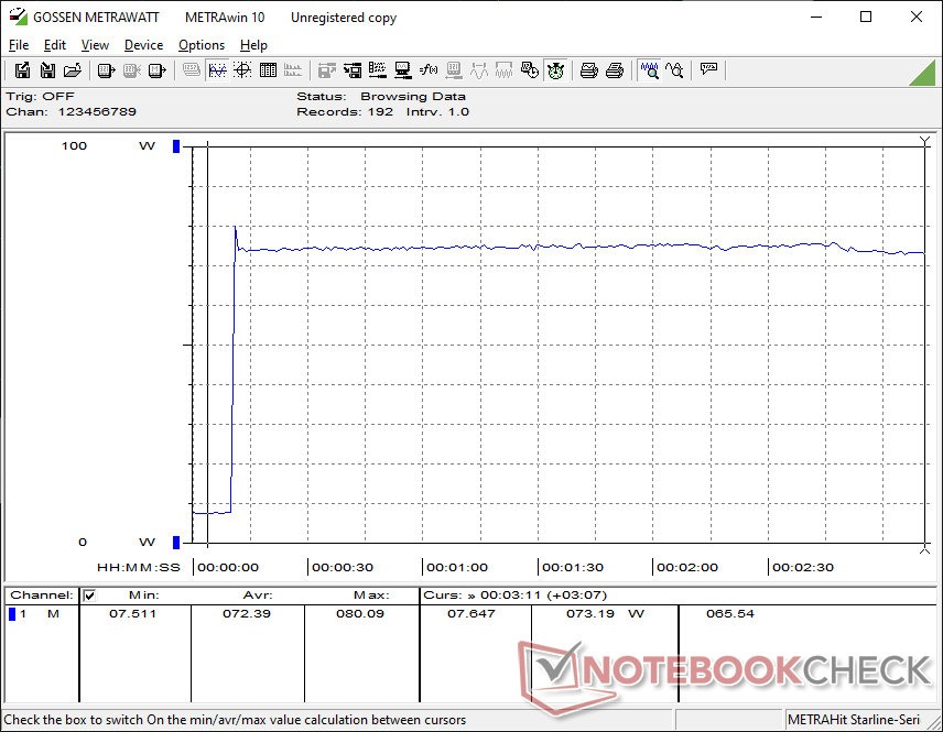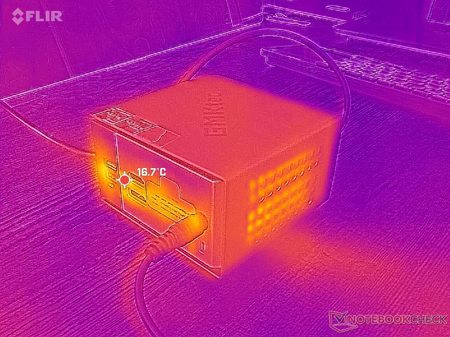 Siamo riusciti a misurare un assorbimento massimo di 80 W dall'adattatore CA da 120 W di medie dimensioni (~13,3 x 5,8 x 3,2 cm).