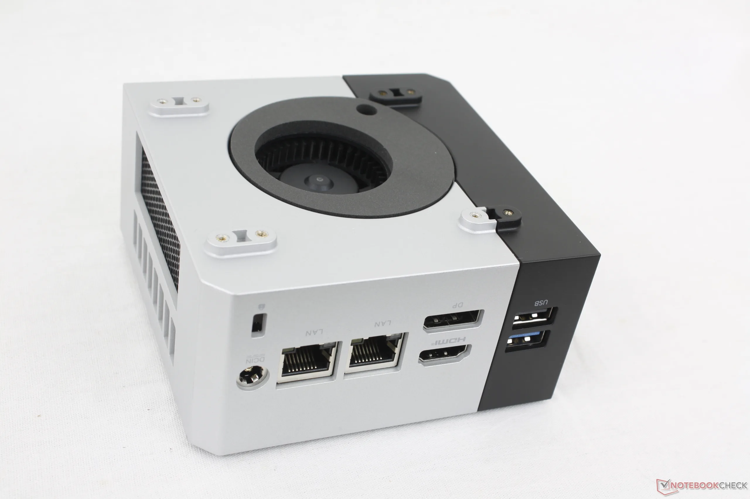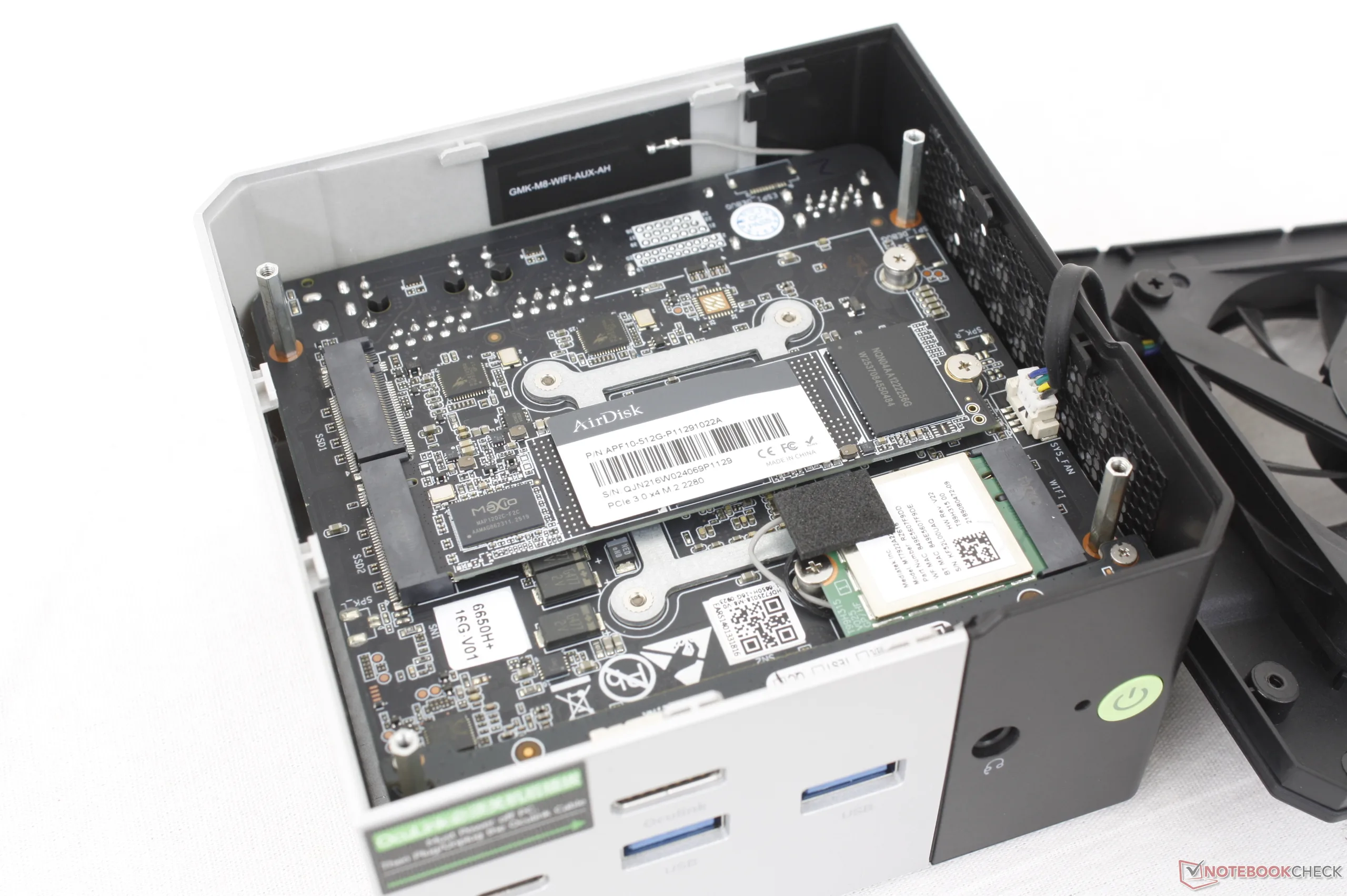 L'involucro esterno è fissato da quattro viti a testa zigrinata per facilitare la manutenzione, ma per accedere alla scheda madre è necessario un cacciavite Phillips. Il sistema supporta fino a due SSD M.2 2280 PCIe4 e un modulo WLAN rimovibile.