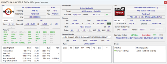 | GMK NucBox M8 AMD Ryzen 5 PRO 6650H ⎘ AMD Radeon 660M ⎘ 16 GB Memoria, 512 GB SSD | Amazon: | 494 gr | 63 mm | x | |
